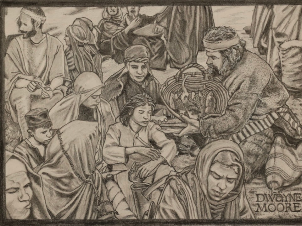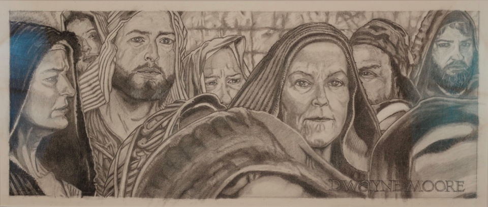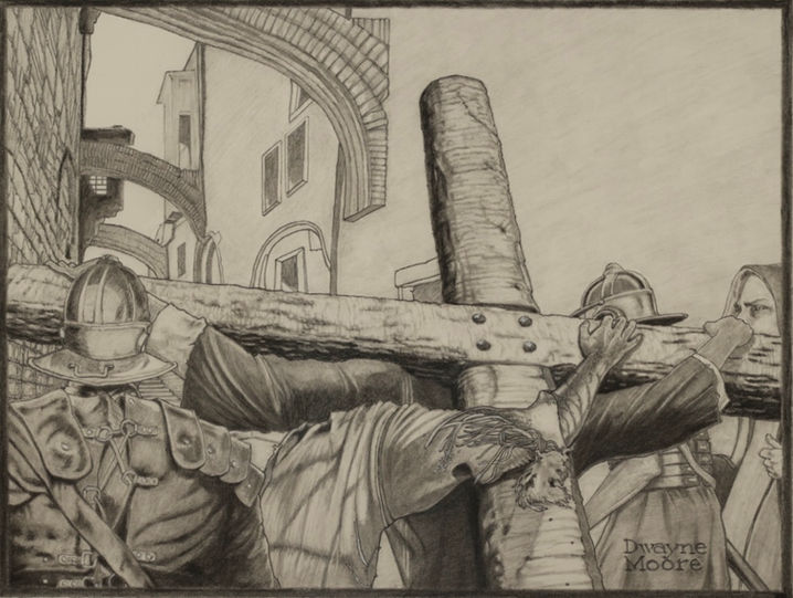 Recently, Moore's artwork has returned to his Christian roots, illustrating biblical and historical scenes such as the Via Dolorosa and the Five Loaves of Bread and Two Fish. He continues his journey in religious works by using the techniques of the masters in three stages: line, form, and color.